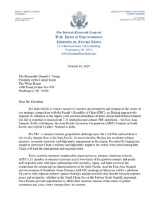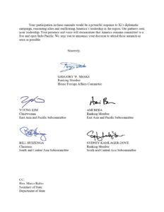 पत्र में सांसदों ने चेताया कि बीजिंग क्षेत्र में अपने प्रभाव को तेजी से बढ़ा रहा है, इसलिए ट्रंप की व्यक्तिगत उपस्थिति तीन महत्वपूर्ण बहुपक्षीय सम्मेलनों में इस क्षेत्र में अमेरिका की नेतृत्व भूमिका और चीन की महत्वाकांक्षाओं के खिलाफ मजबूत संदेश देने के लिए अनिवार्य है। इन सम्मेलनों में शामिल हैं, मलेशिया में ईस्ट एशिया समिट, दक्षिण कोरिया में एशिया-प्रशांत आर्थिक सहयोग समिट और भारत में क्वाड नेताओं की बैठक।