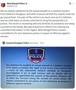 लाइव हिंदी खबर :- पश्चिम बंगाल पुलिस ने दुर्गापुर में ओडिशा की मेडिकल छात्रा के साथ हुए यौन उत्पीड़न की घटना पर गहरा दुख व्यक्त किया है। पुलिस ने स्पष्ट किया है कि इस अपराध के आरोपी बख्शे नहीं जाएंगे और दोषियों को सख्त से सख्त कानून के तहत दंडित किया जाएगा। उन्होंने कहा कि इस घटना से पीड़िता को जो मानसिक और शारीरिक चोट लगी है, वह पुलिस और पूरे राज्य की जिम्मेदारी है और सभी संभव प्रयास किए जा रहे हैं ताकि न्याय सुनिश्चित किया जा सके।