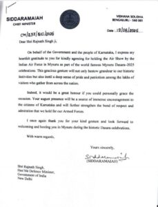 लाइव हिंदी खबर :- मुख्यमंत्री सिद्धारमैया ने रक्षा मंत्री राजनाथ सिंह को एक पत्र लिखा है। हालांकि पत्र की विस्तृत सामग्री सामने नहीं आई है, लेकिन सूत्रों के अनुसार इसमें राज्य से जुड़े अहम मुद्दों और केंद्र सरकार से सहयोग को लेकर बातें रखी गई हैं।