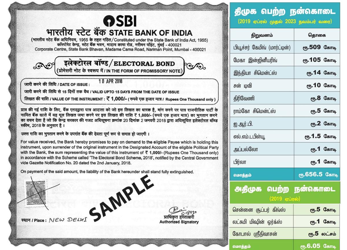 द्रमुक, अन्नाद्रमुक: डीएमके को चुनावी बांड से 656.5 करोड़ रुपये मिले हैं. इसमें से 509 करोड़ रुपये लॉटरी टाइकून सैंटियागो मार्टिन की फ्यूचर गेमिंग कंपनी द्वारा प्रदान किए गए हैं। अकेले मार्टिन का दान डीएमके के कुल चुनाव बांड फंड का 83 प्रतिशत है। मार्टिन ने चुनावी कागजात के जरिए डीएमके समेत विभिन्न राजनीतिक दलों को 1,368 करोड़ रुपये का चंदा दिया है. इसका 37 फीसदी हिस्सा डीएमके को मिला है.