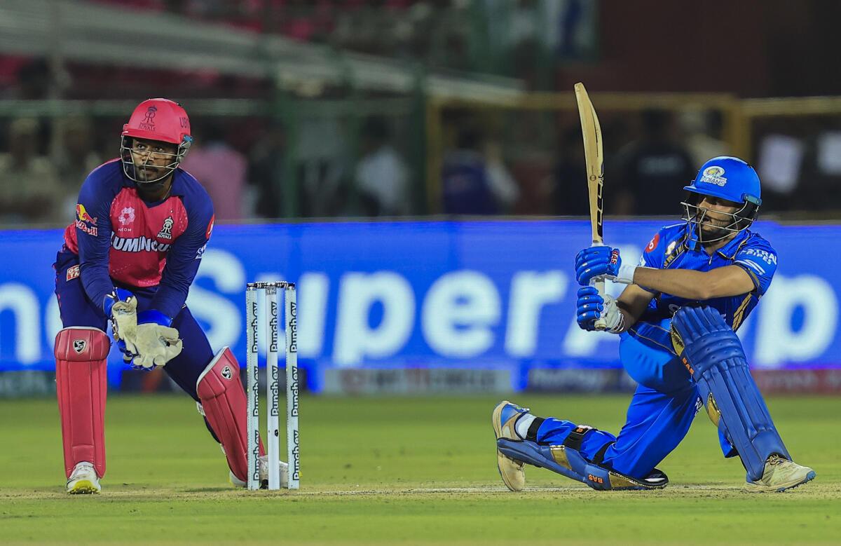 हार्दिक पंड्या 10 रन, तिलक वर्मा 65 रन, गेराल्ड कोएट्जी बिना कोई रन और टिम डेविड 3 रन बनाकर खेल रहे हैं, निर्धारित 20 ओवर की समाप्ति पर मुंबई ने 9 विकेट के नुकसान पर 179 रन जोड़े। राजस्थान की ओर से संदीप शर्मा ने सबसे ज्यादा 5 विकेट, ट्रेंड बोल्ट ने 2 विकेट, आवेश खान और युवेंद्र चहल ने 1-1 विकेट लिया.